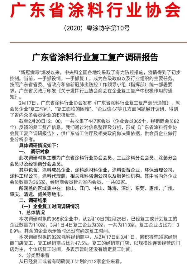 截至2月20日12:00,我们收集了447家会员(企业会员365个,经销商会员82个)反馈的复工复产信息。我们通过对信息整理及分析,形成《广东省涂料行业协会复工复产调研报告》,供广东省工信厅及相关政府做决策依据,供会员企业做行业分析参考。
