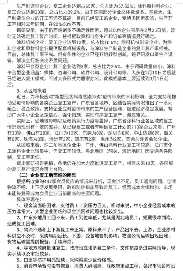 生产制造型企业:复工企业达到占65家,总占比为57.52%;涂料原材料企业:复工企业达到33家,总占比为29.2%;由于这两部分企业总体数量多,基数大,生产制造型企业的开工率还不算高。目前已经复工的企业,受诸多因素影响,生产开工率相对去年同期,在20%-50%不等。