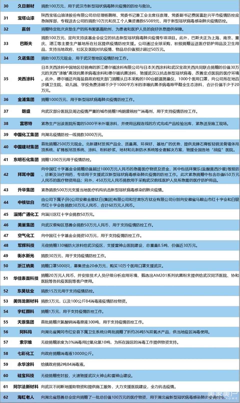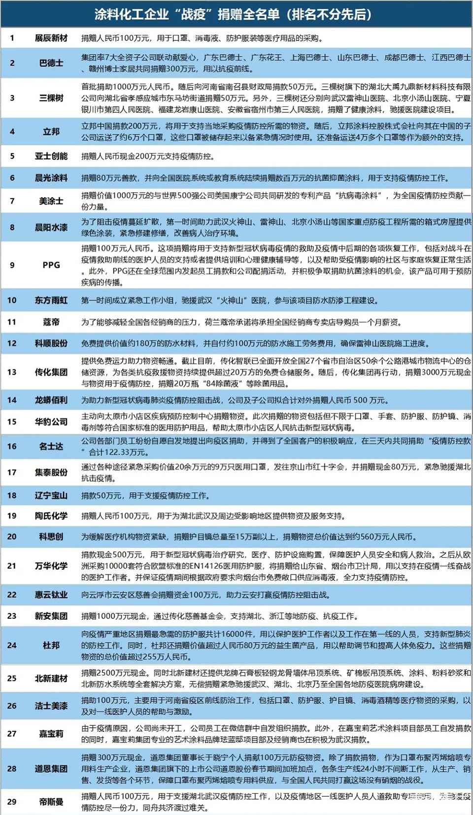 《中外涂料周刊》和《中外涂料网》第一时间关注疫情防控阻击战,之前已推出数期专题中外涂料企业战“疫”报道。但疫情还未消散,战“疫”还未结束,越来越多的涂料化工企业,加入到战“疫”大军中。截至2月24日15时,我们根据已经公开的信息汇总了涂料化工企业支持防疫防控名单,以及捐赠捐助金额、物资、项目等。爱心汇聚,我们一定能战胜疫情,迎接春暖花开。