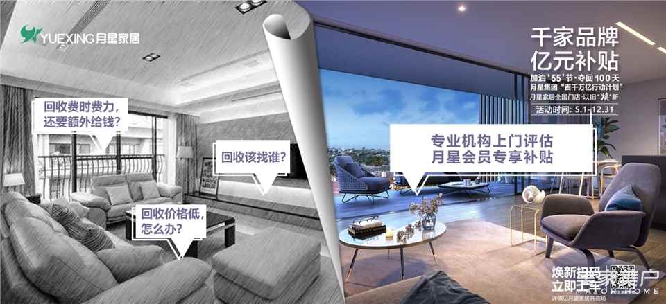 本次月星家居联合千家品牌,亿元补贴助力家庭更新活动,消费者可通过各渠道进行报名预约,凡是有回收价值的旧家具,享上门评估价最高5倍增值,100元变500元,1000元变5000元。(具体补贴细则详见月星家居全国各商场)