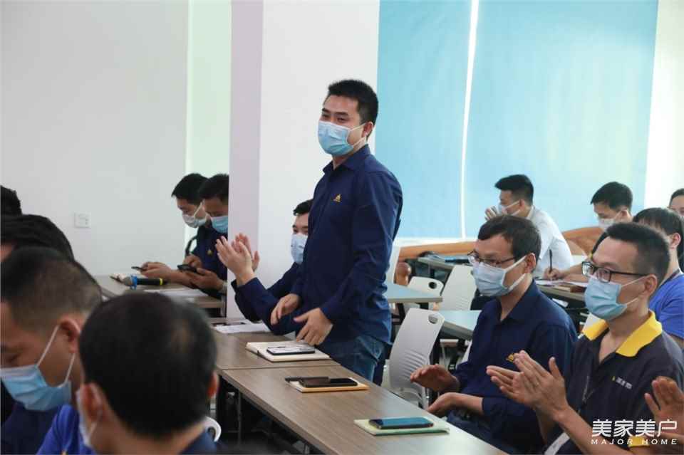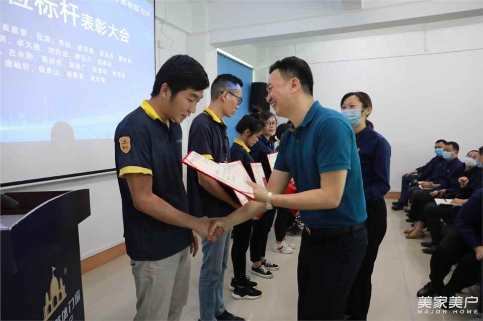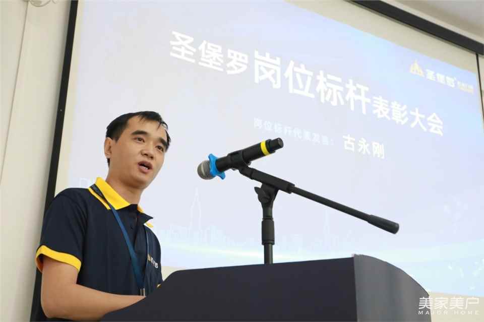 会上,采购中心主管杨学丽、铝窗制造中心班长古永刚作为岗位标杆代表上台发言。