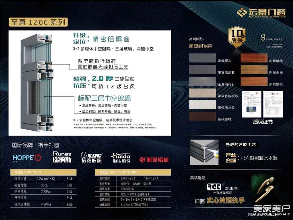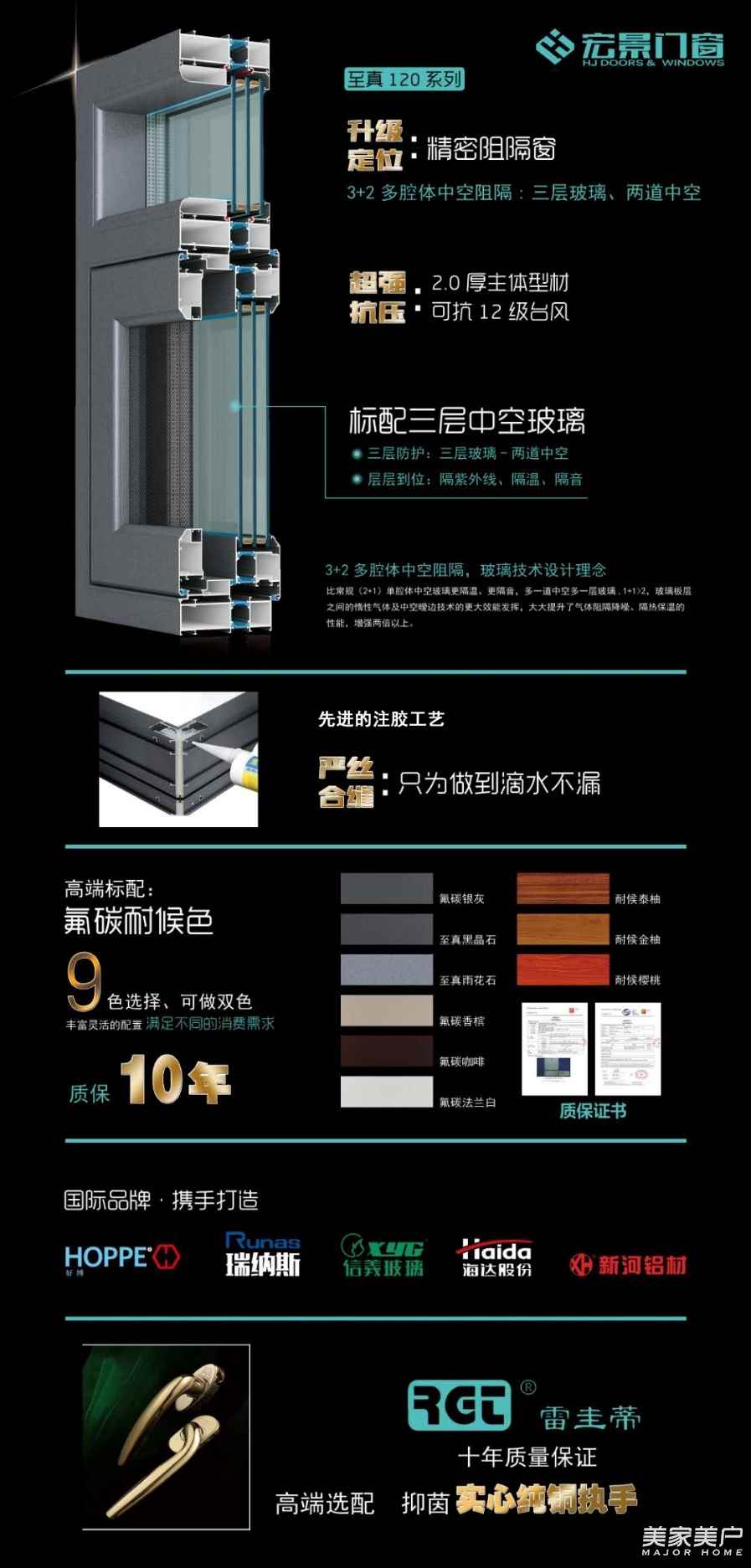 公司最近推出的数款平开窗设计新颖,技术先进,具有很高的密封防水、隔音隔热性能。例如宏景的至真120系列平开窗,采用壁厚达2.0mm的主体型材,可抵御12级以上台风;标配三层中空玻璃,比市面常见的两层中空玻璃具有更加隔音隔热;玻璃压线采用圆柱胶棒无缝扣压工艺,更加防水密封;常用新型组角注胶工艺,防水更加出色......可以说新产品集高性能与高颜值一体,深受市场赞誉。
