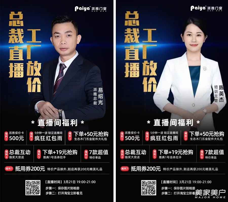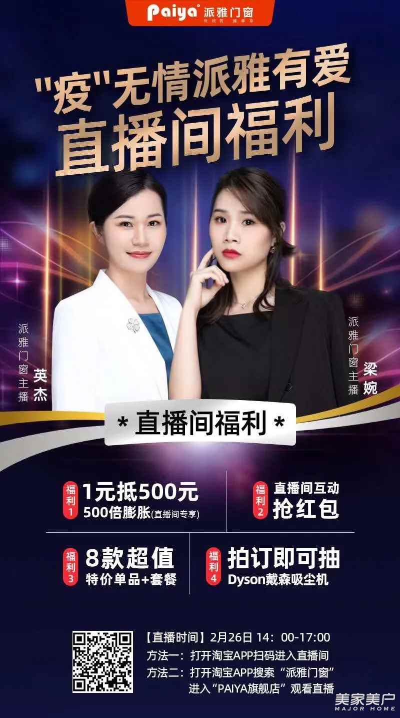 新营销时代已经到来!在5G的潮流下,直播行业发展火热是一种趋势,直播带货成为了一种新型的互动型交易方式。派雅门窗硬核布局直播,举办多次全国联动天猫直播活动,利用直播的优势进行近距离商品展示分享给大众,为消费者深刻认知派雅的品牌力量和专业度,让销售边界不断扩大,也为派雅的经销商打开了新的思路,新的销路,也为助力品牌实现品效销合一的直播价值所在。借线上直播活动为契机,一如既往秉承匠心精神,优化现有结构,加快线上线下的融合,为国内外消费者提供更优质的产品与服务,倾力打造深受消费者喜爱和推崇的民族品牌。