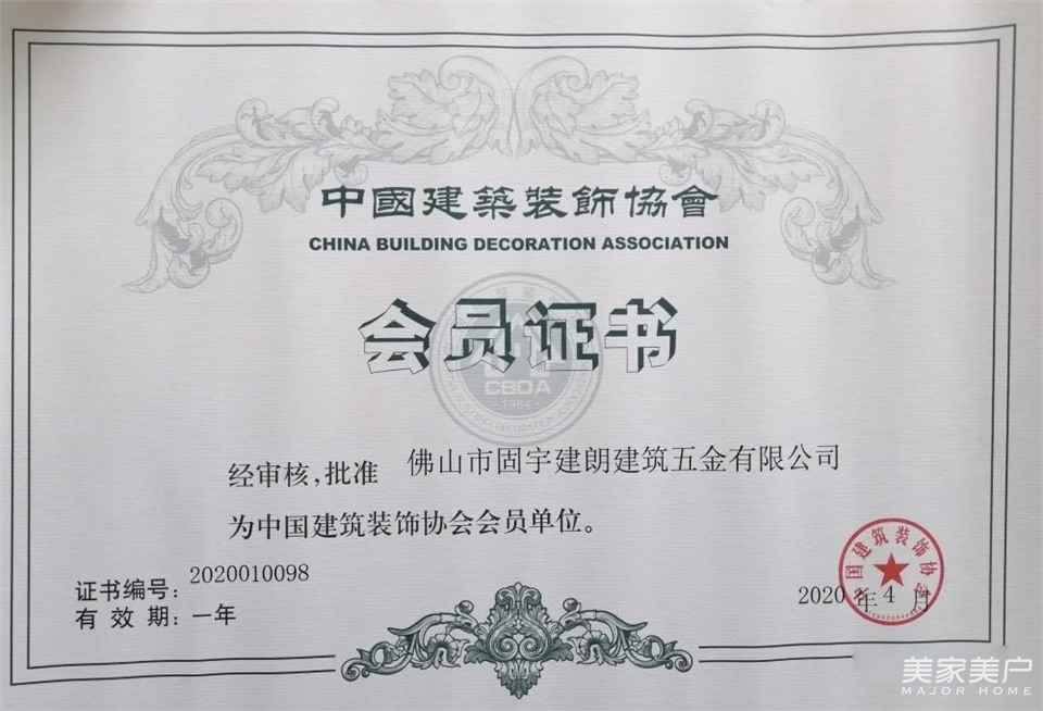 历经严格筛选,中国建筑装饰协会权威审核批准:佛山市固宇建朗建筑五金有限公司为中国建筑装饰协会会员单位。这“国字号”的授予,证明了固宇家装五金的产品品质、行业口碑、品牌影响、服务质量等得到中国建筑装饰协会和建筑装饰行业的充分认可!