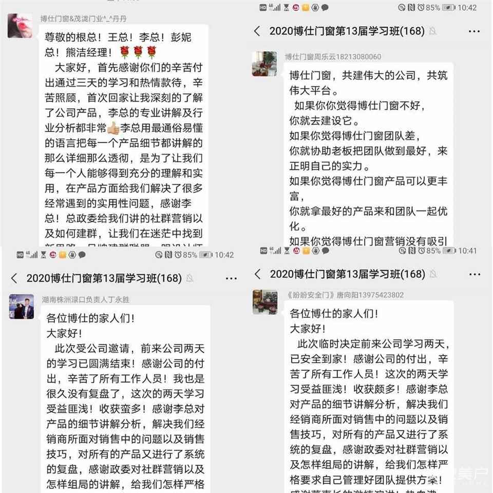 会议结束后,各位经销商也对本次参加学习执行班发表了感言。此次学习之旅也让各位经销商更加切身的感受到博仕门窗无论是产品质量、支持力度还是售后帮扶,都有自己完善的管理制度与体系,更加坚定了与博仕门窗合作发展的信念。