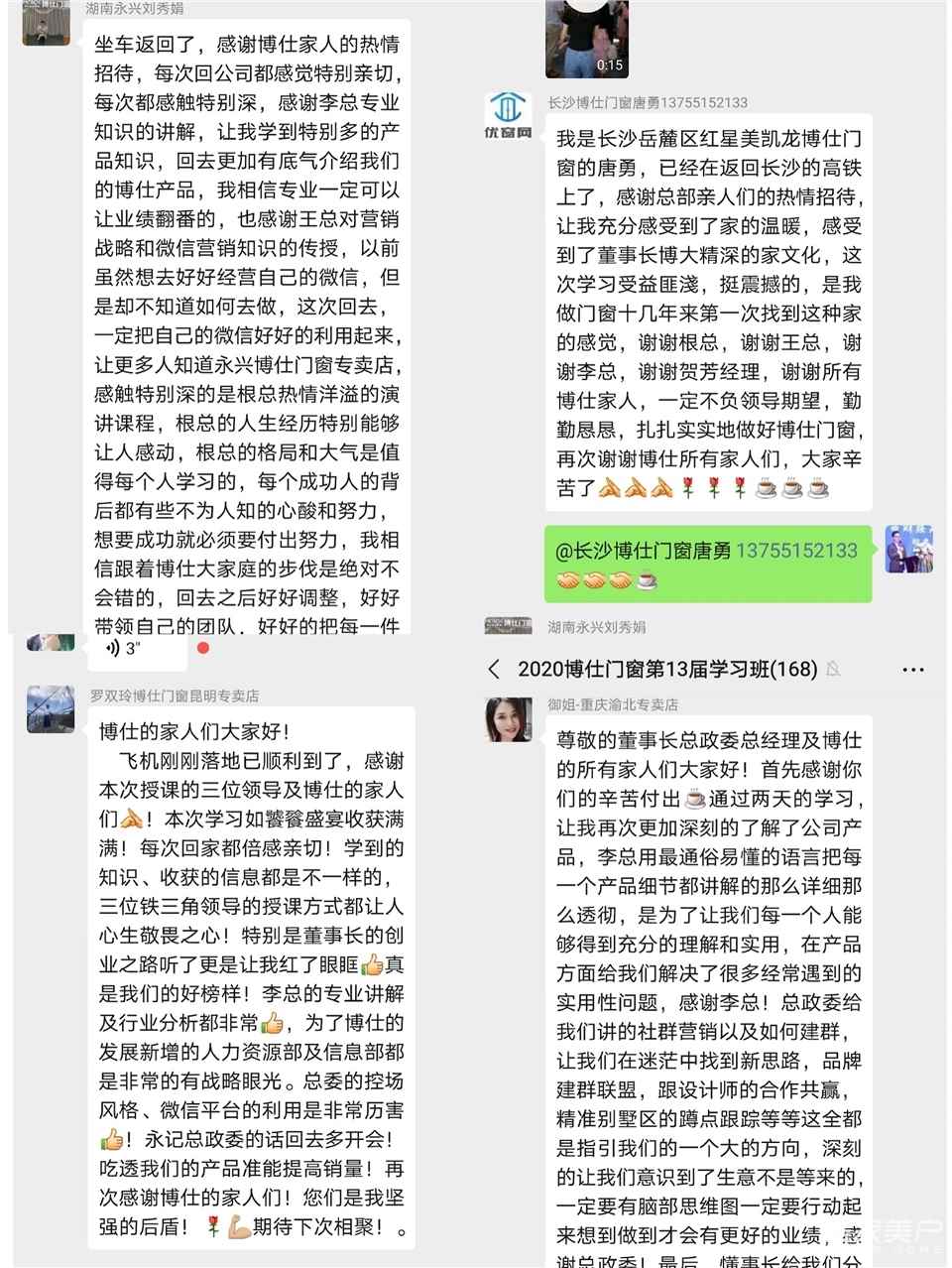 尊敬的:根总,总政委,李总,彭总,熊经理, 以及博仕的所有家人们,这几天你们辛苦了。我是广西玉林邹丽施,刚加入博仕这个大家庭的新商。5月8日第一次到佛山考察厂家,本来我们是直奔另外一个厂家签约的,缘份吧,在路上突然改变了行程,决定先到博仕看看,就见识了博仕的两位人才,黄克双经理和熊杰经理。黄经理的专业知识和丰富多彩的营销大餐及熊杰经理的热情敬业态度吸引了我们,令我们在博仕的停留时间加长。次日,我们到另一厂家准备签约,因之前已经微信转了保证金,并没有选择博仕。其间,熊经理不停致电沟通,我们还是没有回博仕详谈。5月10日晚上我们回到玉林,11日早上,熊经理竟然说要过来玉林。这一举动,着实让我们佩服,这个女孩子是有多拼啊?多勇敢啊,他们只有10%的机会签下我们,因为我们很早就交了保证金给另一个厂家了,就是细节没谈拢而已。我们前脚走后脚就跟来了,还带了一名大将,余卫经理。当天晚上,和我们聊到了晚上11点多,12日早上帮我们去考察商场,分析市场,看新店面位置。中午,我们连详细加盟细节都没深入了解,就转了2万保证金,说句大实话,签的时候完全是懵的。签完后的几天,我们还不确定,我们选对厂家了吗?博仕真的好吗?直到26号带团队到厂家培训这两天时间,我们才真正认识到博仕门窗的企业文化和专业水平,我们才真的肯定,我们没选错厂家,我们跟对了平台,我们因此而充满了信心。我之前也做过门,对做窗完全是小白,这次是抱着空杯状态来学习。之前也对接过大大小小不少厂家,但像博仕这样专业的接地气的培训还真是让我震撼不已。王总和李总的课无论从内容或排课顺序都作了细致的分析安排,详细的材料介绍和社交语言和群销应用和培训量尺等等这些,只给了我这样一个感受,总部就像我们的父母亲,对我们就像对子女一样淳淳教育,目标只有一个,让我们成才。体现了总部给到我们全国经销商的大力扶持和期望。绝对不会发生,招你进来了,让你自生自灭的情况。厂家一直与我们共同成长,共创辉煌。董事长授予我们的是心灵的文化,从自己的经历悟出的许多心得一一分享给我们,让我们少走弯路,不断提升自己,让我们努力做到内外兼修。来自五湖四海的经销商家人们,真的是因为博仕的家文化深入人心,他们毫不保留的分享经验,还有课堂的热烈讨论,还有BOSS群的一呼百应,真的是很大爱,我也为我能成为博仕的一份子而骄傲。最后,我还要夸一夸,博仕最后令我感动的一个环节,这个绝对加分,就是总部想的太周到了,部署的太完美了,竟然做了不同窗形的水泥模型来教量尺寸。真的是很用心。还有,我要感谢一位默默无闻的博仕人王偶初,昨晚匆匆吃了两口饭就赶着送我们去车站,因为买不到票,过了半小时又来接我们回去,今天早上6点多又送我们去车站,真的辛苦了。感谢感谢。我和我的团队都爱博仕门窗,预祝博仕门窗玉林体验馆旗开得胜,与总部并肩前行。