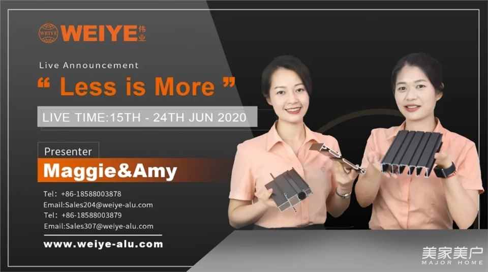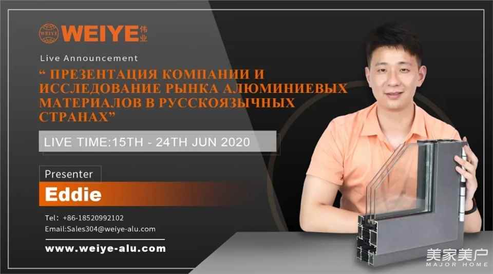 The fair will provide 24-hour live broadcasting platforms for exhibitors to better interact with the buyers throughout the world. Our factory will be there waiting for you, and we will present our live show in English, Russian, Vietnamese. We will We will provide customers with in-depth understanding of our company's existing products: profiles, doors and windows, aluminum furniture, etc.Our factory will display our brand image on the live broadcasting in multiple dimensions through formats such as pictures, videos and 3D imaging to buyers in other parts of the world.本次广交会10天x24小时全天候的直播服务。伟业特地分为英语、俄语、越南语专场,为各个国家的用户带去型材、成品门窗、全铝家具等多款产品。直播视觉从多角度的产品外观、全方位的产品视频、个性化的产品描述以及精准的技术参数,将多维度体现产品优势。