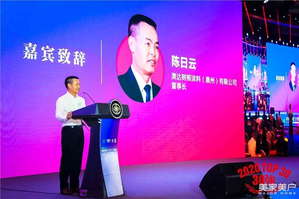 本次年会总冠名、澳达树熊涂料(惠州)有限公司董事长陈日云在年会上发表致辞,他对莅临此次大会的领导嘉宾深表感谢,并盛邀嘉宾到树熊工厂参观。最后,他预祝本次盛会顺利召开,祝愿中国门业的明天更美好。
