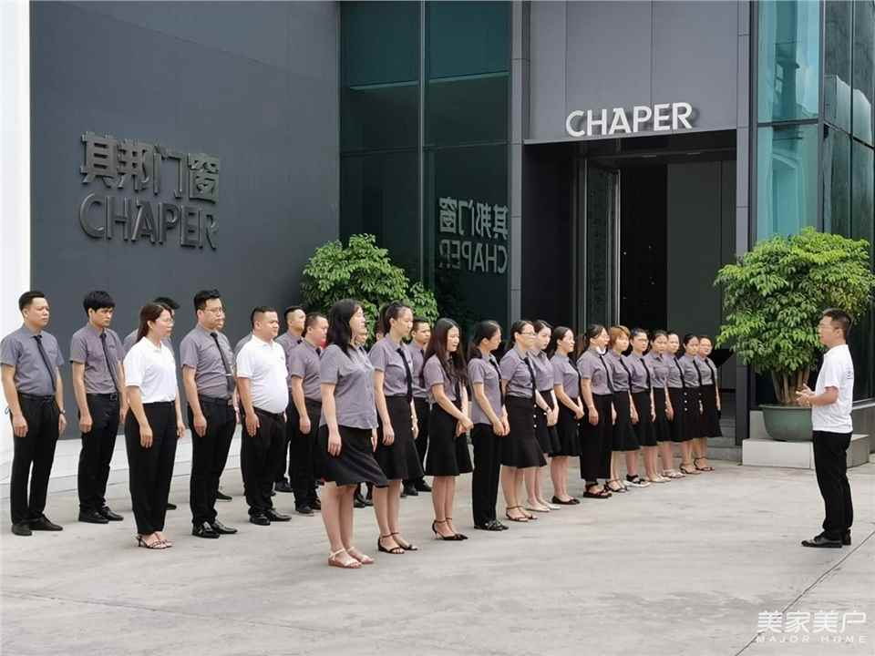 其邦门窗众员工聚集在总部广场,身穿其邦工服,在其邦门窗营销中心总监尧何中的主持下,全体员工整齐划一地进行早会团队风采展示。