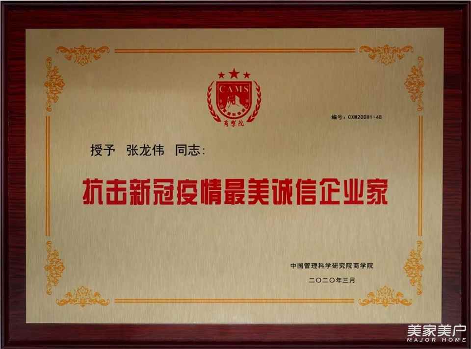 3、2020年3月21日,由于在新冠疫情中为灾区人民作出了卓越的贡献,张龙伟董事长被中国管理科学研究院商学院授予“抗击新冠疫情最美诚信企业家”荣誉称号。