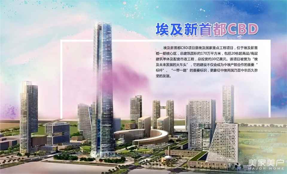 埃及新首都CBD项目是埃及国家重点工程项目,位于埃及新首都一期核心区,总建筑面积约170万平方米,包括20栋超高层/高层建筑单体及配套市政工程,总投资约30亿美元。该项目被誉为“埃及未来发展的火车头”,它的建设不仅是中埃产能合作的重要“标杆”、“一带一路”的重要标识,更象征中埃两国乃至中非历久弥坚的友谊。