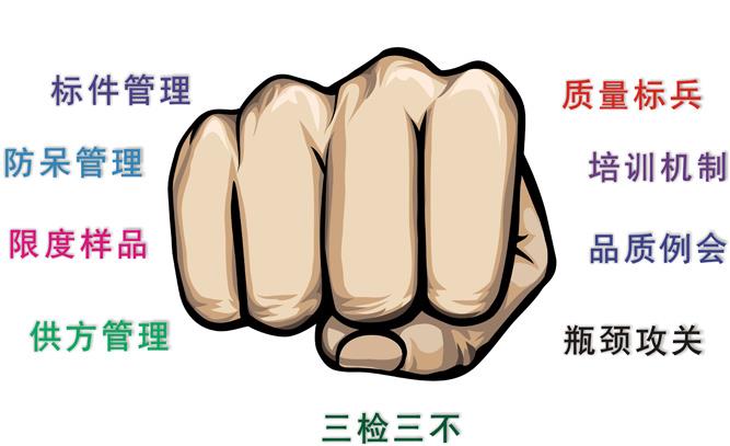 品质管理没有绝招,也没有妙招,更不是管理人员最喜欢以“责任心不行”和“执行力不够”来掩饰自己偷懒不动脑筋导致的管理低效,应该是一套组合拳的方式配套导入,上面的品质管理九大组合拳并不是每一个都要用,而是要结合自己企业的实际择机配套导入。