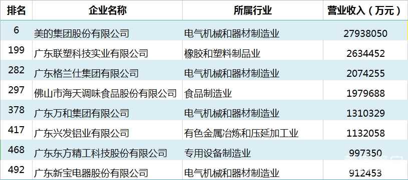 此外,8家上榜2020中国民营企业制造业500强榜单的佛山企业,分别是美的集团股份有限公司、广东联塑科技实业有限公司、广东格兰仕集团有限公司、佛山市海天调味食品股份有限公司、广东万和集团有限公司、广东兴发铝业有限公司、广东东方精工科技股份有限公司和广东新宝电器股份有限公司。其中,美的集团股份有限公司排名第6位。