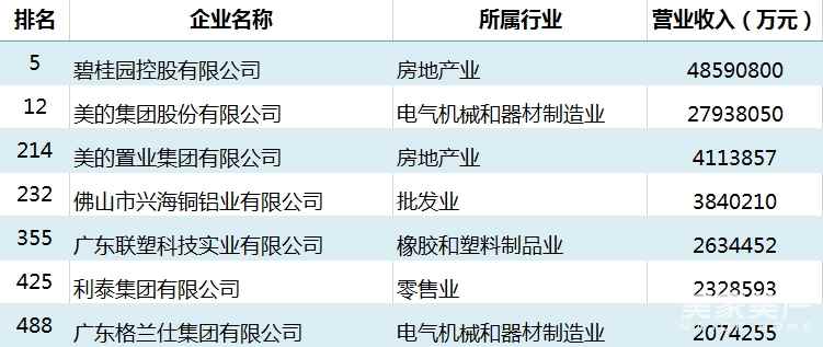 7家上榜2020中国民营企业500强榜单的佛山企业分别是碧桂园控股有限公司、美的集团股份有限公司、美的置业集团有限公司、佛山市兴海铜铝业有限公司、广东联塑科技实业有限公司、利泰集团有限公司和广东格兰仕集团有限公司。其中,碧桂园控股有限公司进入榜单前10位,排名由去年的第7位上升至第5位;美的集团股份有限公司进入榜单前20位,排名由去年的第16位上升至第12位。