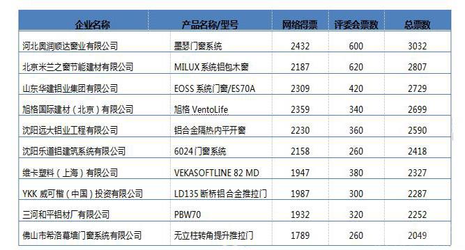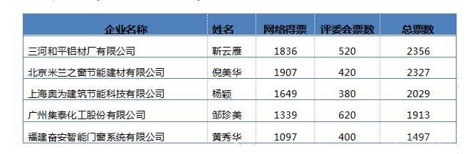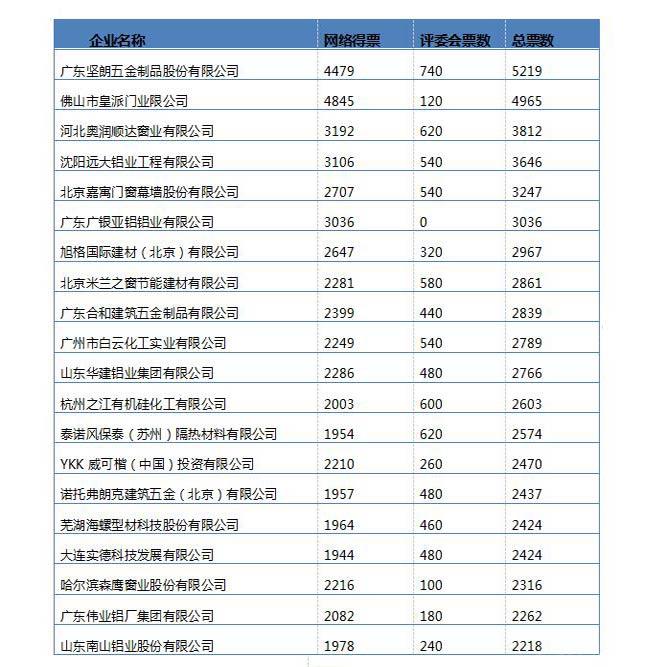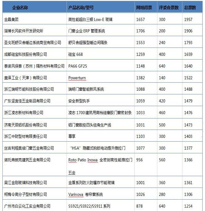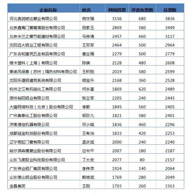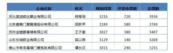 组委会本着公平公正的原则,对参选企业进行层层筛选,通过13位专家评审组参与初评、大众网络投票及评委会委员投票阶段,为期两个半月的激烈角逐后,组委会共收到有效投票共计316532票(其中网络投票257072票,38位评委会委员投票共计59460票),再一次掀起了整个门窗幕墙行业评选的热潮。最终本次评选在274个入围奖项中共有20个品牌、10家企业、30项创新产品、6项工程及30位人物从中脱颖而出。