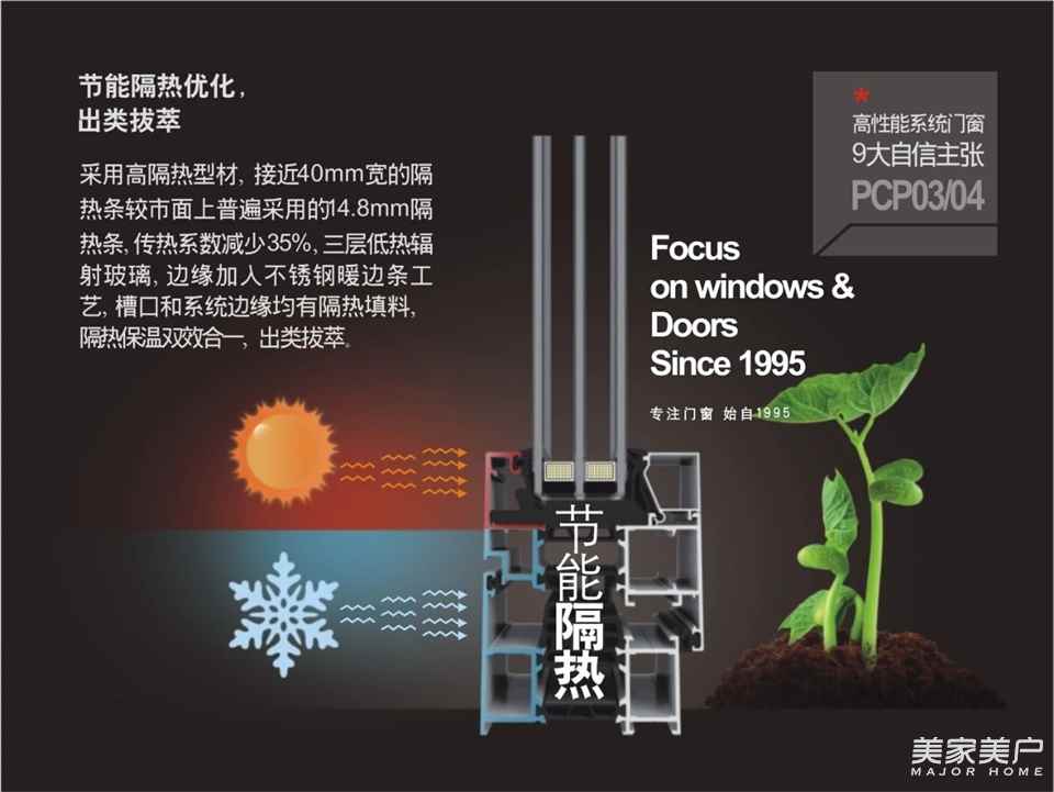 导热:PCP03采用德国泰诺风25.3MM隔热条,节能效果比市面上14.8MM隔热条,窗框传热系统减少35%。PCP04采用泰诺风35.3MM宽隔热条,同比市面上窗框传热系数减少45%。