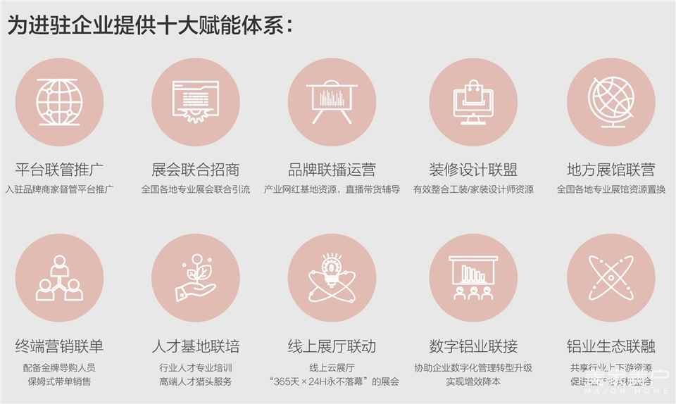 十大赋能体系,让天下没有难做的生意。杨总介绍说:“一是平台联管推广,对入驻品牌商家督管平台推广。二是与全国各地专业展会联合引流。三是开发产业网红基地资源,品牌联播运营。四是有效整合工装、家装设计师资源,打造装修设计联盟。五是全国各地专业展馆资源置换,地方展馆联营。六是配备金牌导购人员,终端营销联单。七是打造行业人才专业培训,人才基地联培。八是协助企业数字化管理转型升级。九是共享行业上下游资源,铝业生态联融。十是线上展厅联动,打造永不落幕的展会生态。”