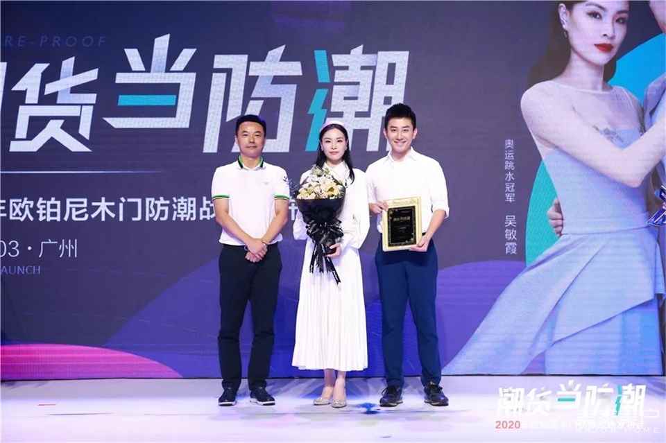 发布会上,欧派家居集团总裁助理王枢为奥运冠军家庭吴敏霞、张效诚颁布授权证书,诚邀为欧铂尼防潮星推官!