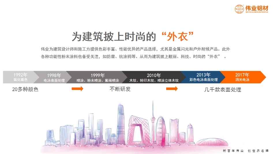 近30年来,伟业始终以”科技兴伟业,质量创名牌“来督促鞭策自己,不断突破新技术,优化升级型材工艺结构、研发耐火抗菌等功能。在国内各类大型著名标志性建筑项目中,都可看到伟业铝材发挥的作用。