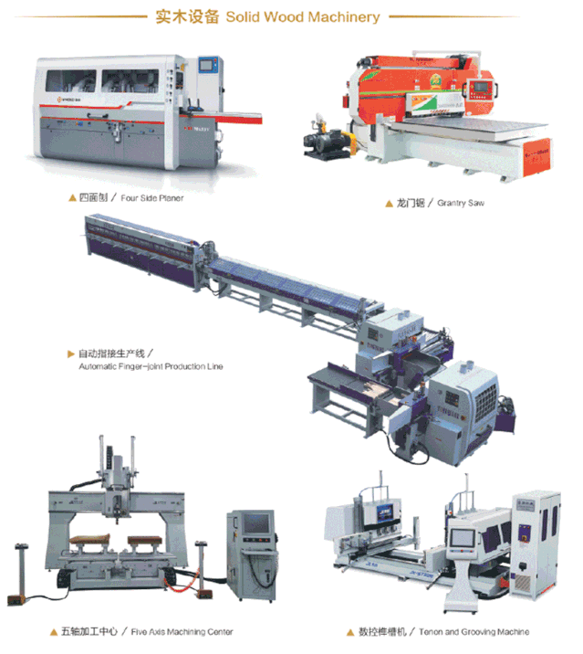 - 实木类:全自动指接生产线、数控锯、四面刨、五面加工中心、榫槽机、门窗生产设备、异形生产设备、冷热压机、智能实木生产线。