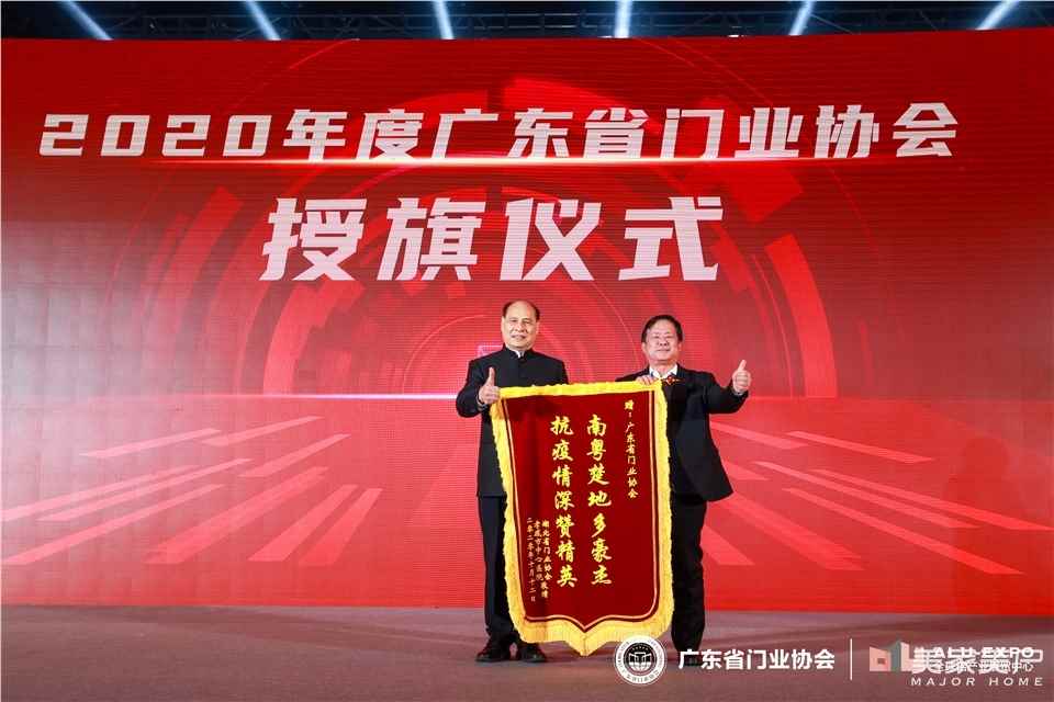 为感谢广东省门业协会疫情期间对湖北的驰援,湖北省门业协会秘书长柯晴川为广东省门业协会会长关润开赠送荣誉锦旗。