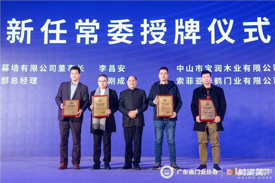 在广东省门业协会常委班子亮相环节,关润开会长为富轩门窗董事长李昌安、宝润木业董事长司徒立权、诗尼曼门窗总经理张刚成、索菲亚华鹤木门总经理刘志超4位新常委授牌;同时,嘉宾还为广东省门业协会27位常委单位颁发了协会年度“领军企业”荣誉牌。