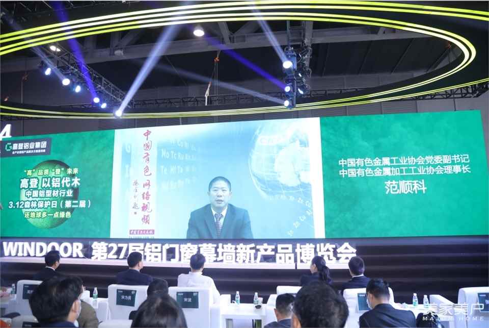 中国有色金属工业协会党委副书记、中国有色金属加工工业协会理事长范顺科通过视频发表讲话。一则短短的视频,让我们知道,范书记说高登作为中国铝型材行业的第一梯队品牌代表,践行绿色环保的理念,高度肯定高登铝业举办以铝代木,保护森林,保护地球活动的初心。