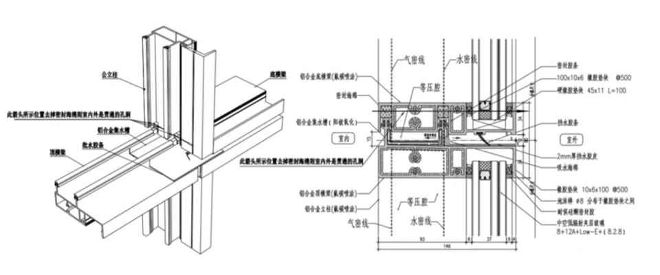 ▲单元式玻璃幕墙防水构造形式横剖(右图)、竖剖(左图)节点