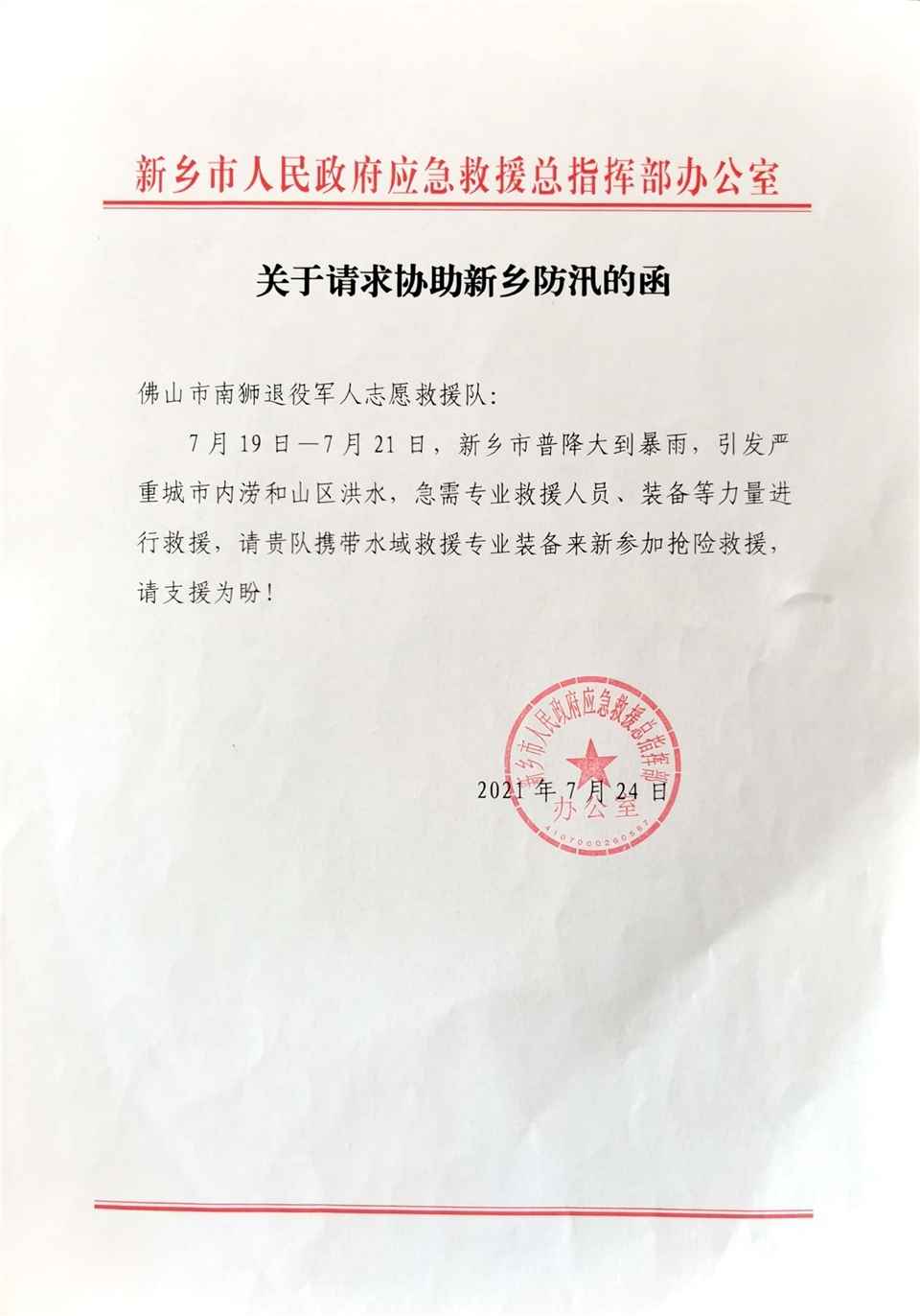 7月21日上午10点,佛山南狮退役军人志愿救援队(以下简称佛山南狮救援队)接到河南郑州严重灾情求援指令。经请示佛山市团委、佛山市退役军人事务局、佛山市应急局等部门,征得同意后,广东省门业协会党支部书记、佛山南狮救援队队长马建华马上召集队员集结,备勤。集结,备勤完毕后,由马建华书记带领28名队员,携带5台四驱大功率越野车、1台专业平板拖车,3艘30匹马力专业冲锋艇,以及一批适合水域救援的常备救援物资,于当晚八点准时出发,前往驰援河南郑州和新乡。