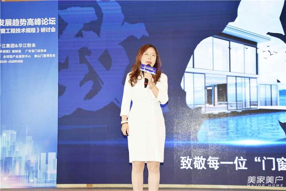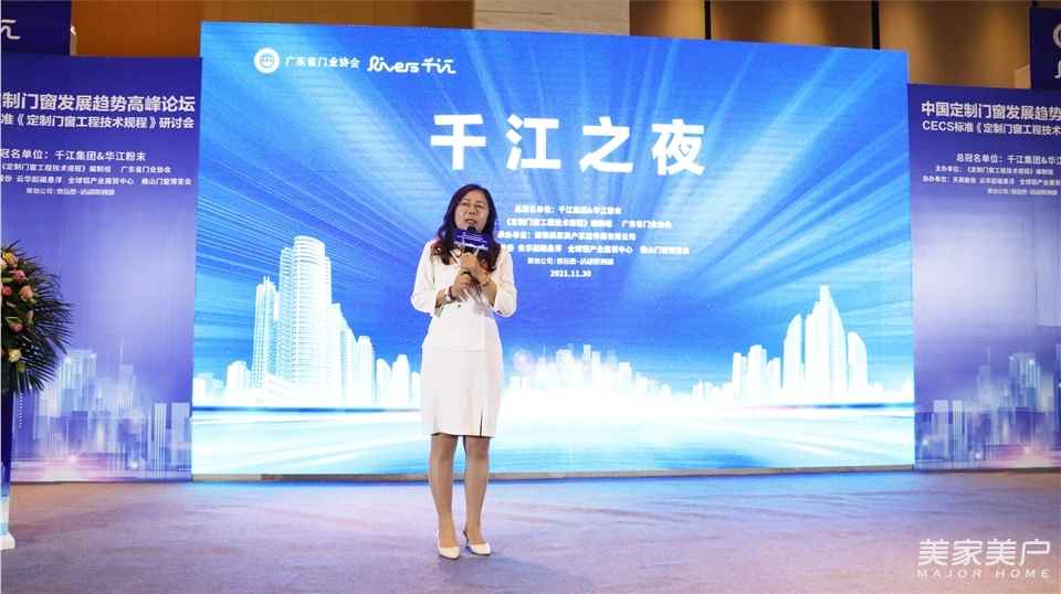 千江集团副总裁暨粉末运营中心总经理王爱兰在会上致辞。她说:“2021年,每一个行业、每一个企业,都经历了不平凡的一年。新冠疫情的影响、世界经济秩序的调整、原材料价格暴涨,企业经营面临一系列困难。在此背景下,中国定制门窗发展趋势高峰论坛暨CECS标准《定制门窗工程技术规程》研讨会的召开,体现了门窗行业的企业家精神以及对行业的热爱。门窗企业坚守初心的精神值得致敬。产业链上下游企业间的交流和学习,更有利于门窗产品的提档升级。企业的职责和使命是不断地满足人们对生活质量的追求。虽然危机依然存在,但是危中有机,‘双碳’、旧房改造等政策的出台为门窗行业的发展带来巨大发展空间,门窗行业的春天即将到来。”
