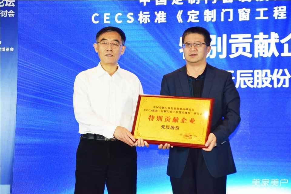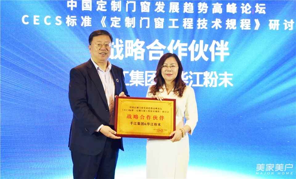 在晚宴授牌环节,全国建筑幕墙门窗标准化技术委员会秘书长、研究员王洪涛为千江集团副总裁暨粉末运营中心总经理王爱兰颁发了中国定制门窗发展趋势高峰论坛暨CECS标准《定制门窗工程技术规程》研讨会“战略合作伙伴”荣誉牌。广东省建筑科学研究院教授级高级工程师、广东省建设科技与标准化协会秘书长石民祥为天辰股份总经理周倩颁发了中国定制门窗发展趋势高峰论坛暨CECS标准《定制门窗工程技术规程》研讨会“特别贡献企业”荣誉牌。