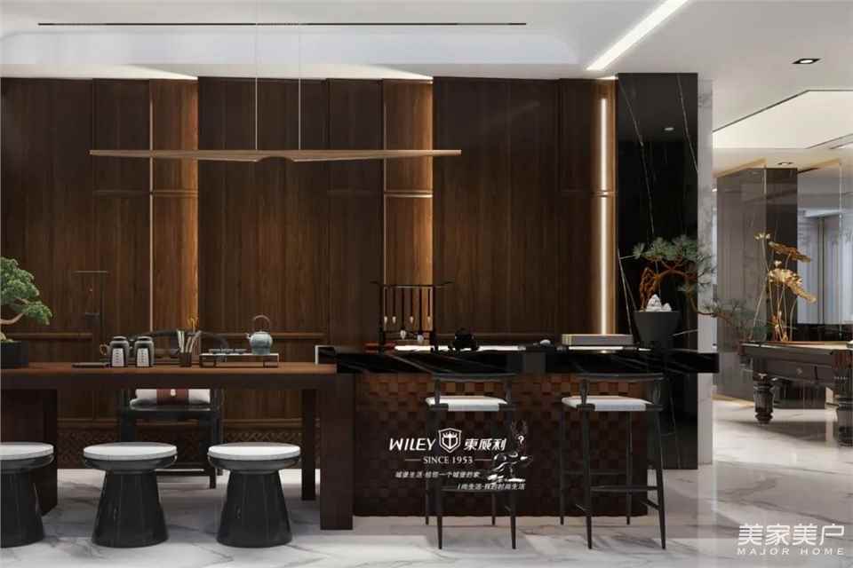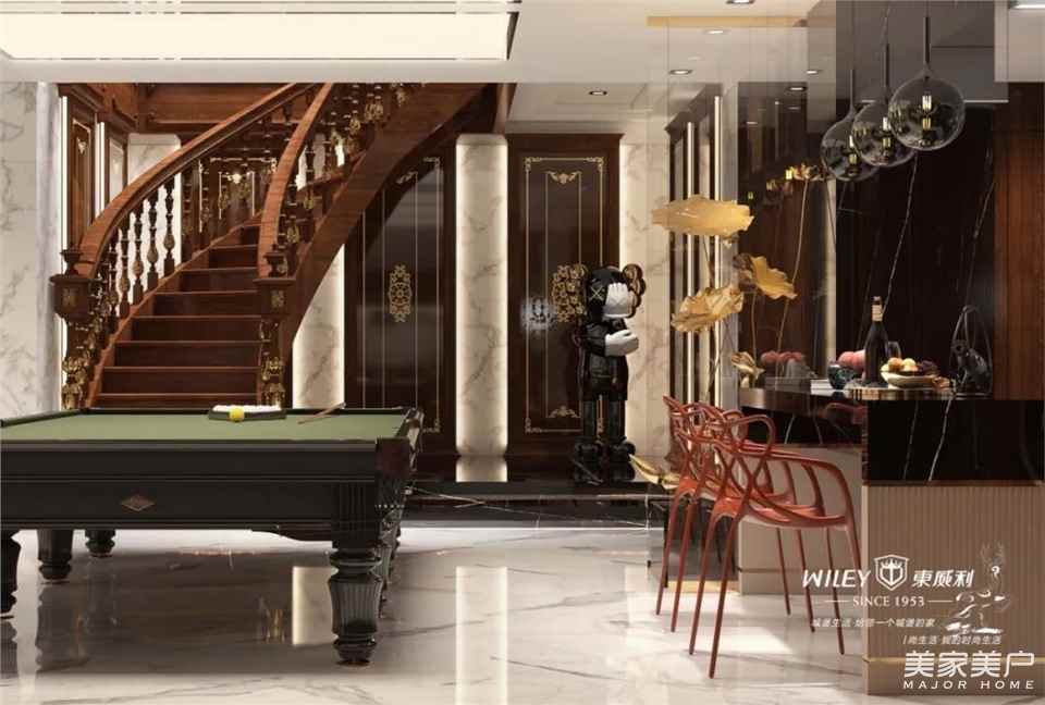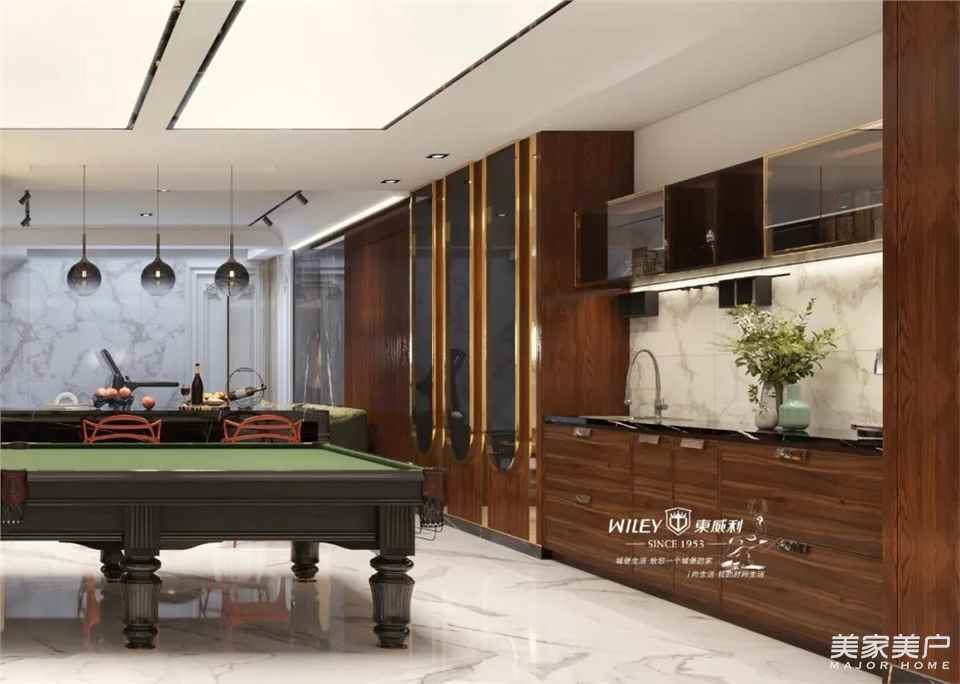 吧台与桌球台一体化布局,大幅提升视野通透性,各空间的模糊界定,也丰富了空间的趣味性,再次拉近了家人之间的情感距离。