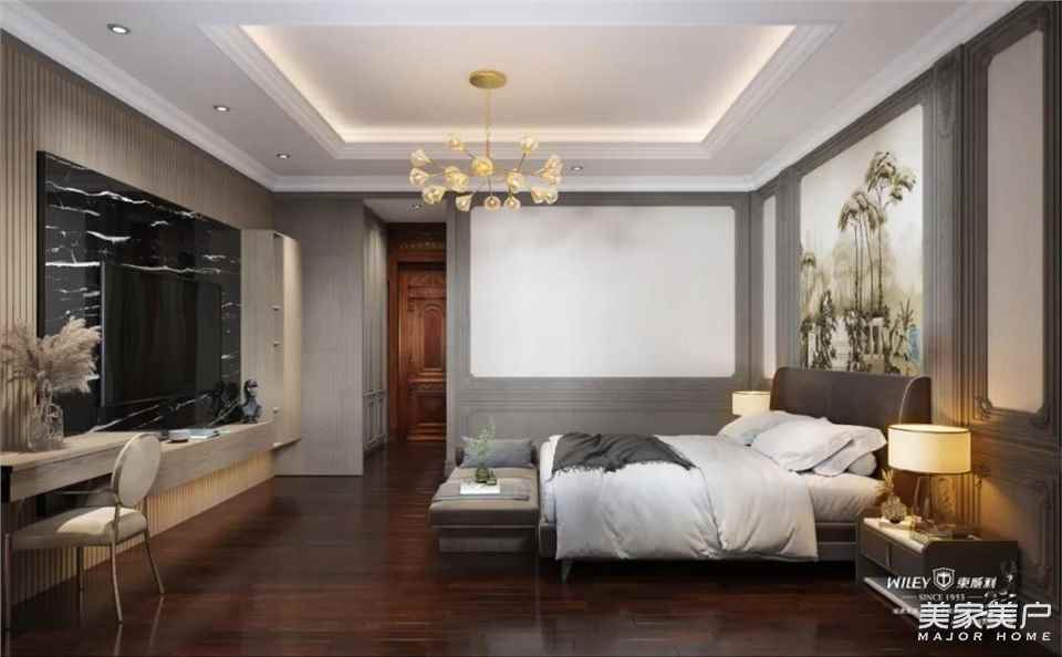 卧室以灰色木色为主色调,电视墙以黑色岩板为背景,一派沉稳静谧之感。顺势延伸至天花的金色吊灯,巧妙成为装饰造型,令空间在视觉上更有延展性。
