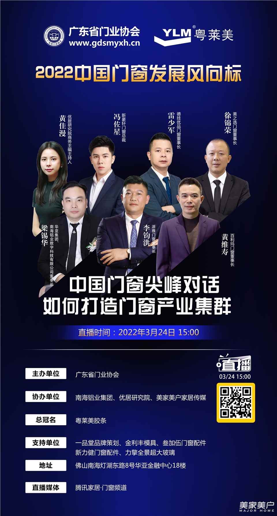 3月24日,由粤莱美胶条总冠名、广东省门业协会主办的“2022中国定制门窗发展风向标尖峰对话”线上直播活动在佛山华亚金融中心隆重举行,并通过腾讯家居·门窗频道全网直播。本次活动得到粤莱美胶条、南海铝业集团、优居研究院、一品堂品牌策划、金利丰模具、叁加伍门窗配件、新力健门窗配件、力擎全景超大玻璃,以及伟德betvlctor旧版传媒的大力支持。