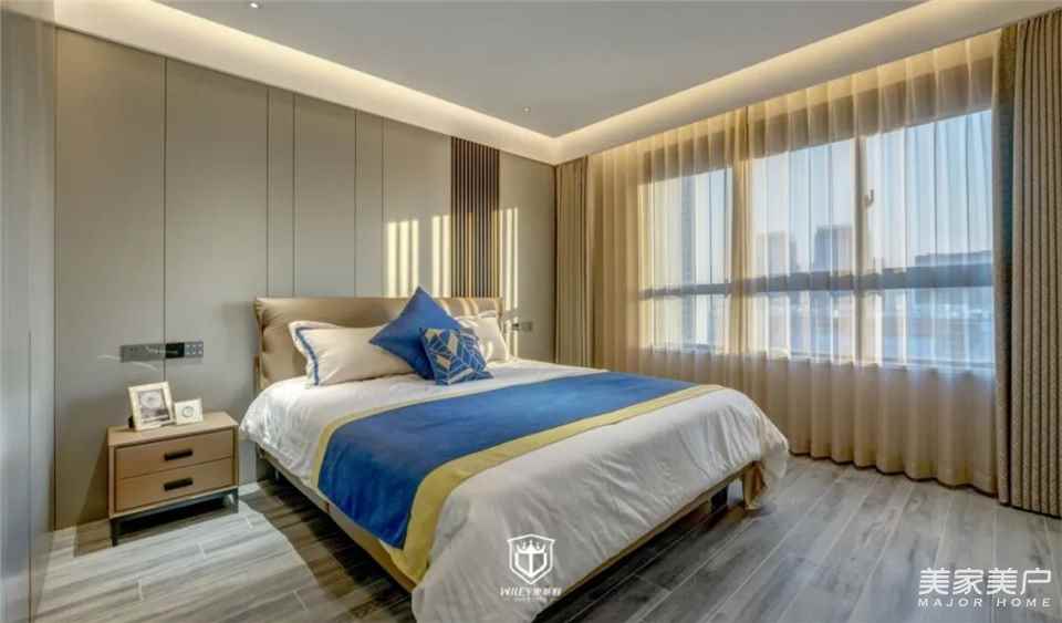 自由的感受始终源于内心的深处,而置身完美的空间,将所有的情绪沉浸在意象的国度里。主卧以灰白色点亮整体空间,细腻的线条,优雅的结构,塑造出不一样的居室美感。