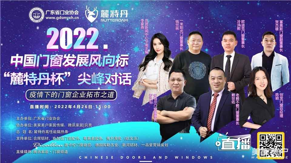 4月26日,由广东省门业协会主办,腾讯家居、伟德betvlctor旧版协办的第6期线上直播对话活动在广州市荔湾区珠江钢琴创梦园(大歌局)举行。本次直播活动由“麓特丹高性能隔热条”总冠名,并得到合辉铝材、叁加伍门窗配件、粤莱美胶条、博升滑轮(欧宝派)、DICALLEN迪卡伦门窗新控、德国库勒五金、新河铝材、一品堂营销策划的大力支持。