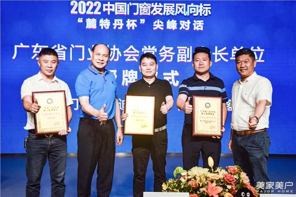 在授牌仪式环节,广东省门业协会会长李钧洪、理事长关润开,共同为星派门窗、欧迪克门窗、百利玛门窗三家新增常务副会长单位授牌。