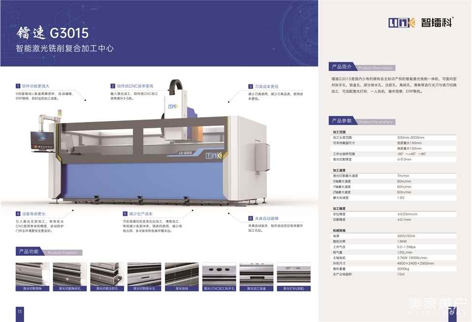 该设备的软件功能更强大,较传统CNC效率更高,刀具成本更低,设备寿命更长,减少生产成本,还可实现夹具自动避障。 产品功能:激光切割清角;激光切割角码孔;激光切割注胶孔;激光切割排水孔;激光划线;激光、CNC加工执手孔;激光加工锁盒;激光打标(选配)。