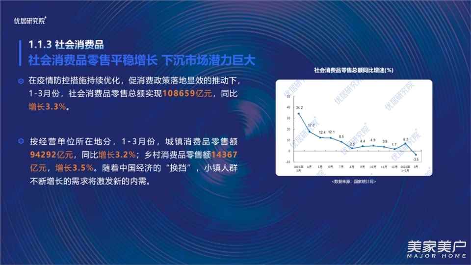 社会消费面分析,社会消费品零售平稳增长,下沉市场潜力巨大。数据显示,在疫情防控措施持续优化,促消费政策落地显效的推动下,1-3月份,社会消费品零售总额实现108659亿元,同比增长3.3%。 其中,家具类零售额达到339亿元,同比下降7.1%。