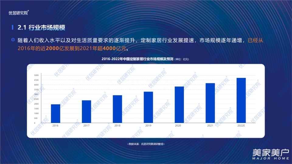 随着人们收入水平以及对生活质量要求的逐渐提升,定制家居行业发展提速,市场规模逐年递增,已经从2016年的近2000亿发展到2021年超4000亿元。