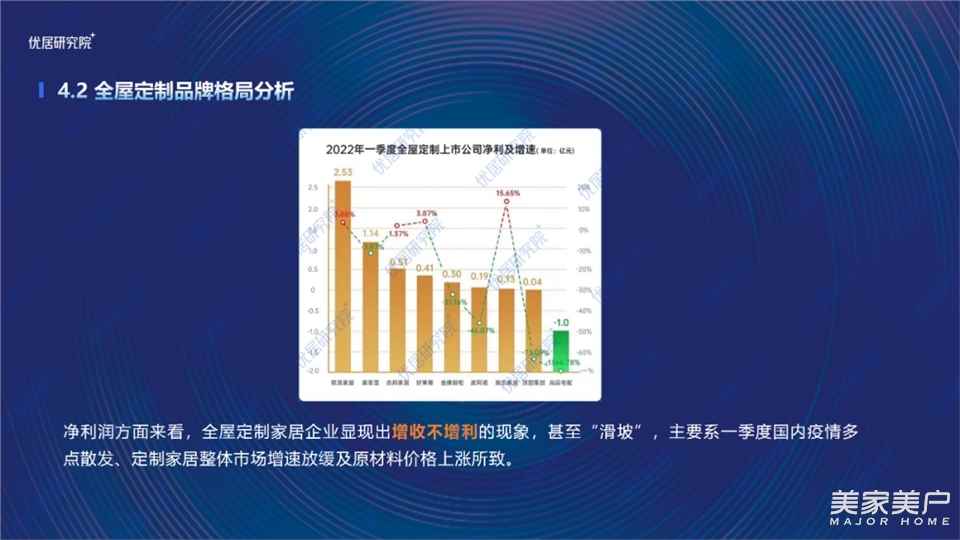 净利润方面来看,全屋定制家居企业显现出增收不增利的现象,甚至“滑坡”,主要系一季度国内疫情多点散发、定制家居整体市场增速放缓及原材料价格上涨所致。