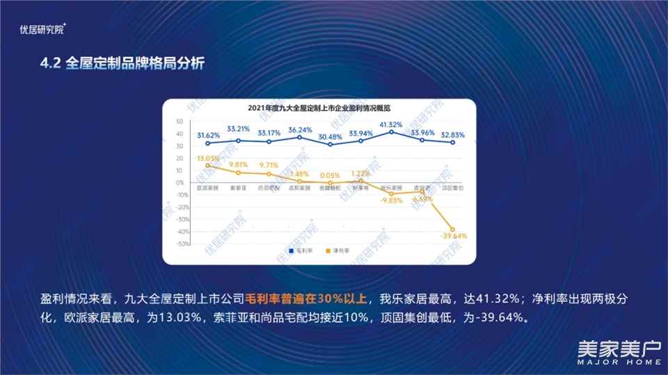 盈利情况来看,九大全屋定制上市公司毛利率普遍在30%以上,我乐家居最高,达41.32%;净利率出现两极分化,欧派家居最高,为13.03%,索菲亚和尚品宅配均接近10%,顶固集创最低,为-39.64%。