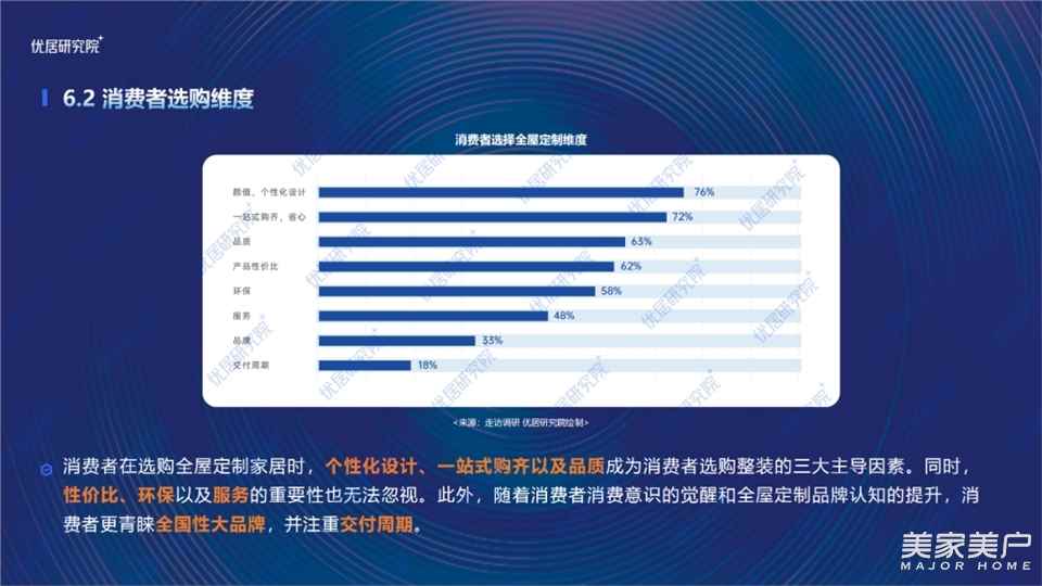 消费者在选购全屋定制家居时,个性化设计、一站式购齐以及品质成为消费者选购整装的三大主导因素。同时,性价比、环保以及服务的重要性也无法忽视。此外,随着消费者消费意识的觉醒和全屋定制品牌认知的提升,消费者更青睐全国性大品牌,并注重交付周期。