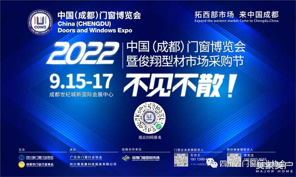 2022中国(成都)门窗博览会将于9月15日—17日举办,展会将立足西部、面向全国、走向世界,助力门窗行业高质量发展。