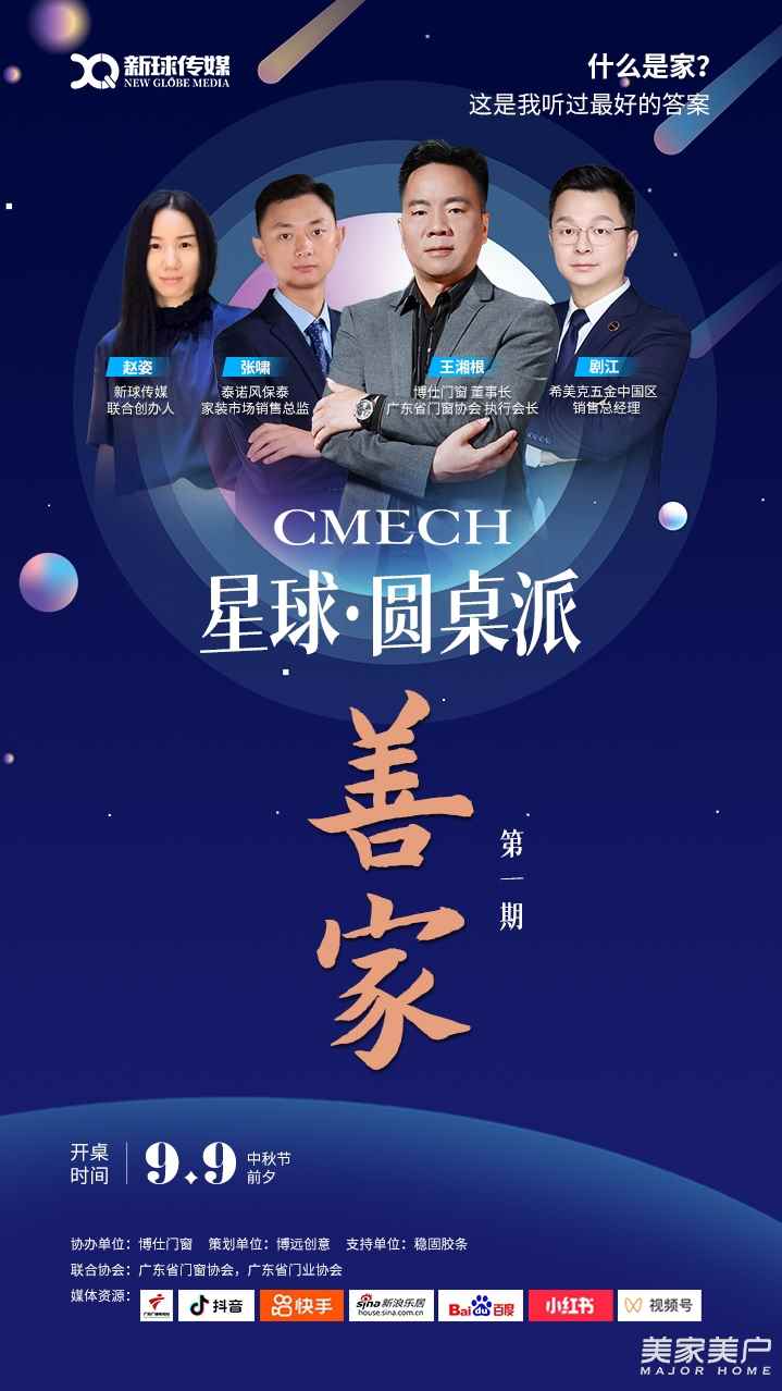 历经一年时间的筹备,星球.圆桌派破圈探索,打通了行业资源、品牌资源、媒体资源,形成有料、有趣、有价值的平台。因为每扇门窗都是一份对家的承诺,第一期圆桌派以【善家】开题,由门窗五金系统领导品牌CMECH希美克为冠名单位,将于2022年9月9日中秋节前夕拉桌畅聊。