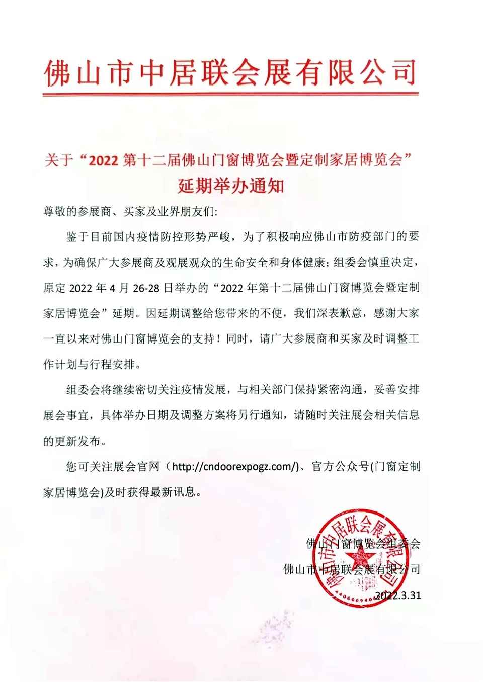 鉴于目前国内疫情防控形势严峻,为了积极响应佛山市防疫部门的要求,为确保广大参展商及观展观众的生命安全和身体健康;组委会慎重决定,原定2022年4月26-28日举办的“2022年第十二届佛山门窗博览会暨定制家居博览会”延期。因延期调整给您带来的不便,我们深表歉意,感谢大家一直以来对佛山门窗博览会的支持!同时,请广大参展商和买家及时调整工作计划与行程安排。