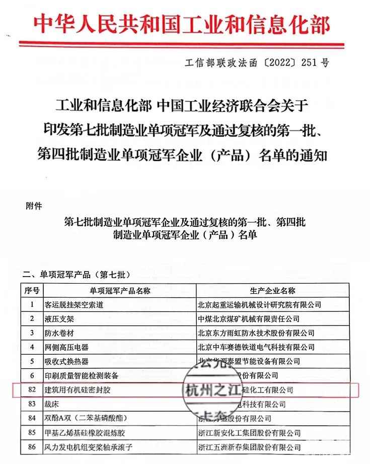 近日,工业和信息化部印发了第七批制造业单项冠军企业(产品)名单,共评选出“单项冠军企业”140家、“单项冠军产品”199项。杭州之江有机硅公司的建筑用有机硅密封胶喜获“2022年第七批制造业单项冠军产品”荣誉称号。