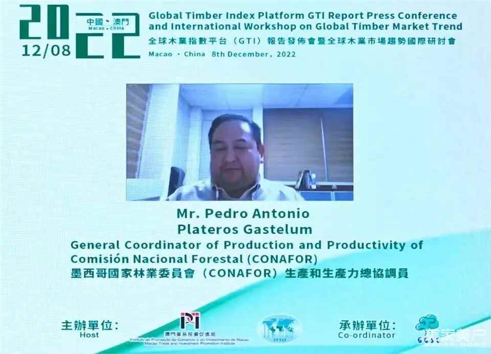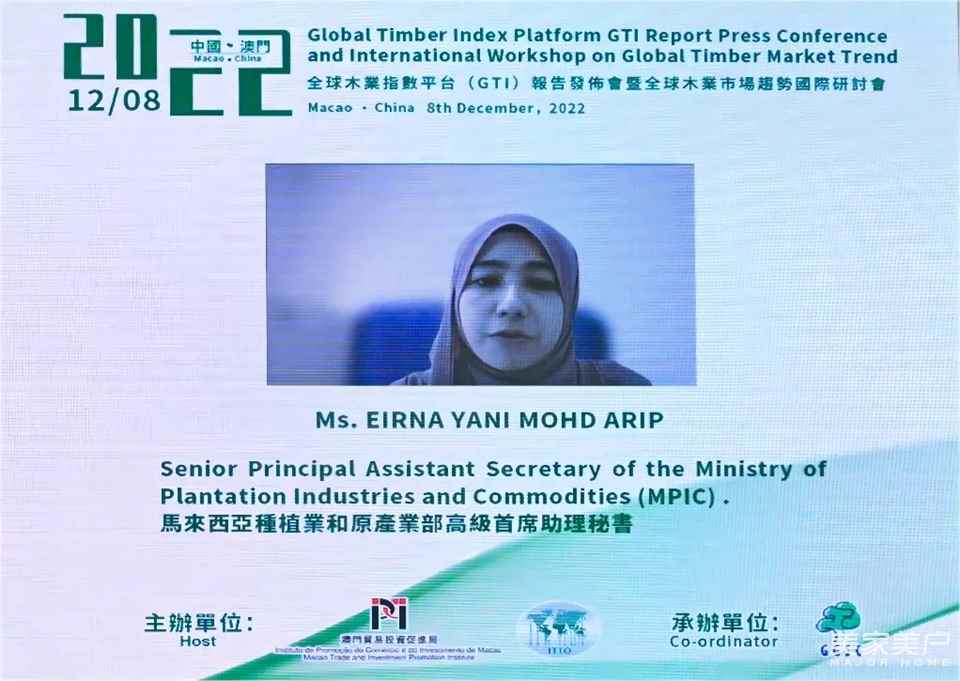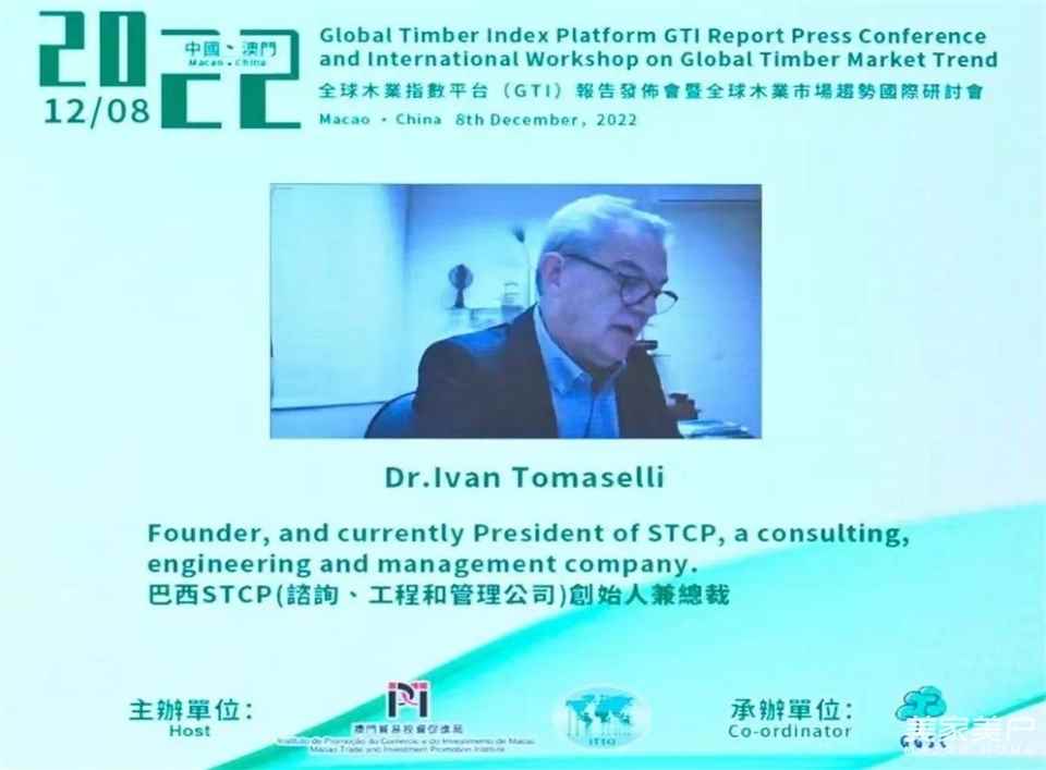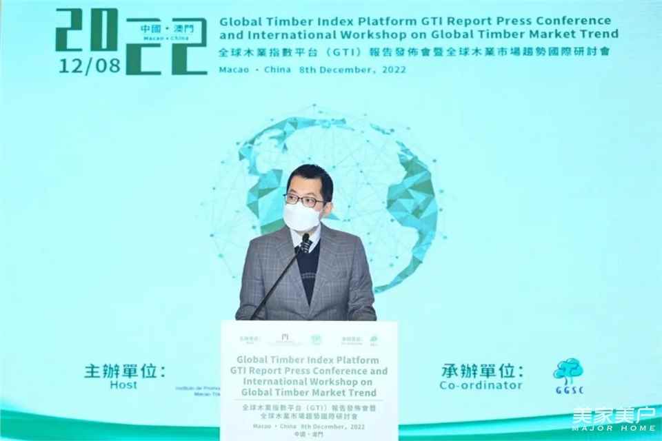 2022年12月8日,“全球木业指数平台(GTI)报告发布会暨全球木业市场趋势国际研讨会”在澳门召开,第一期全球木业指数(GTI)月度报告正式对外发布。澳门贸易投资促进局(IPIM)余雨生代主席、国际热带木材组织(ITTO)执行主任Sheam Satkuru参会并致辞,来自12个国家的木业企业、协会和研究机构等共计170多名参会者通过线上线下方式参会。