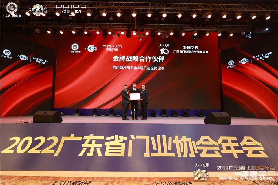 威柏斯&斯贝迪对行业所做的贡献,得到协会的权威认可。晚宴现场,广东省门业协会会长李钧洪 、理事长关润开,共同为威柏斯&斯贝迪颁发2022年度广东省门业协会“金牌战略合作伙伴”荣誉牌。同时,威柏斯&斯贝迪还历经层层筛选,获评“金牌供应商”荣誉称号。一举斩获“双项”大奖,威柏斯&斯贝迪的品牌力在门窗行业进一步提升。