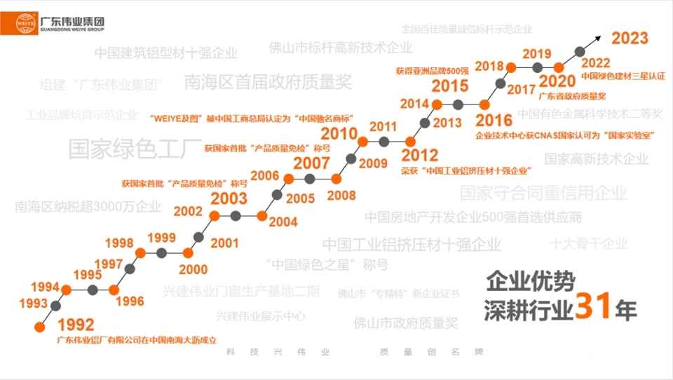 深耕铝型材行业31年,广东伟业集团(WEIYE)以“科技兴伟业,质量创名牌”的理念蓬勃开拓,如今发展为一家大型综合铝型材高新技术企业。